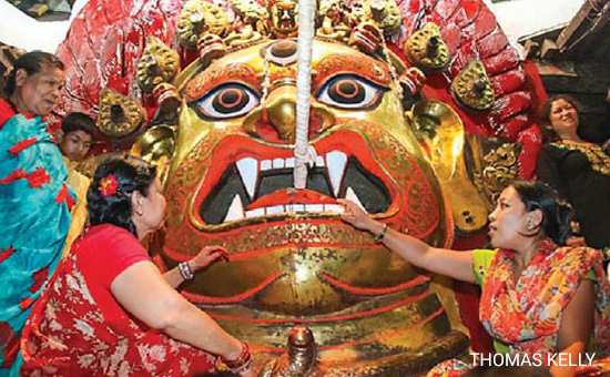 to drums and cymbals, chariots carrying murtis (physical images) of two Hindu Gods—Ganesha and the fierce Bhairav manifestation of Siva—are hauled by human muscle through the streets. The crowning moment is when the Kumari, Kathmandu’s “living Goddess,” who is said to embody a form of Durga, makes one of her rare public appearances in an immense chariot of her own.